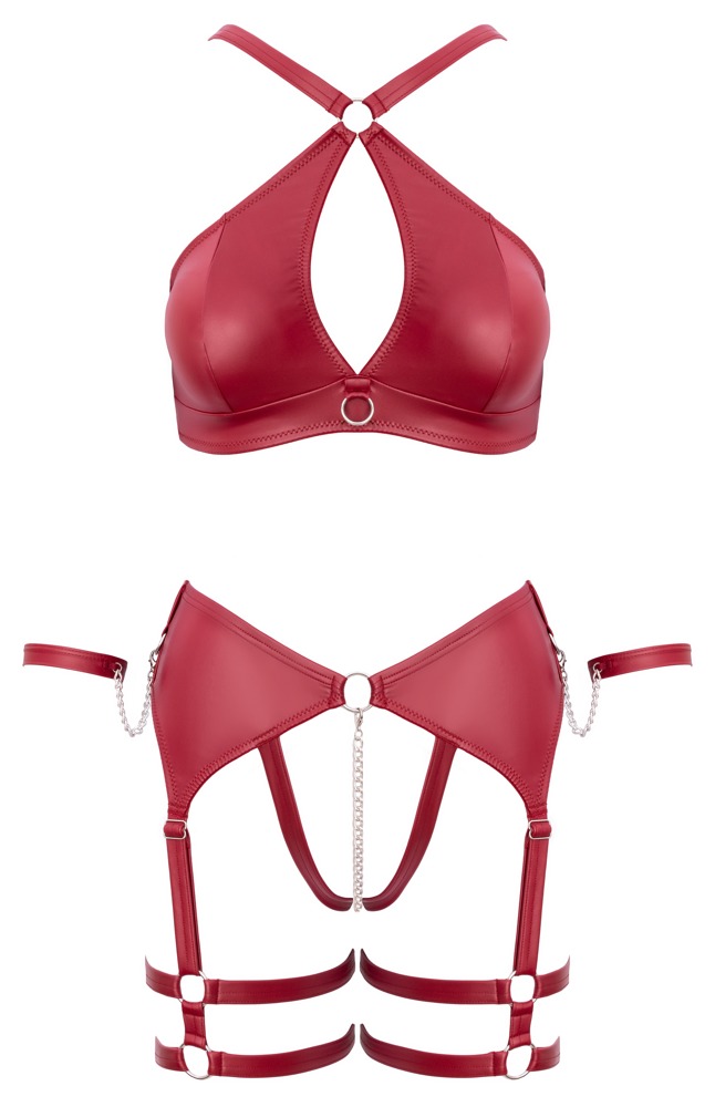 De set bestaat uit een bh met zachte cups, een open jarretelstring en bijpassende handboeien. De bh is voorzien van een opvallende ring tussen de cups en heeft verstelbare bandjes en een haaksluiting op de rug voor een comfortabele en verleidelijke pasvorm. De open string in jarretelgordel-look is volledig open bij het kruis en bevat een afneembare intieme ketting, voor extra spanning en variatie.