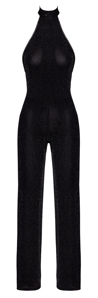 Het halternekdesign met een elegante opstaande kraag zorgt voor een verfijnde touch, terwijl de rechte pijpen je silhouet verlengen. De jumpsuit is rugloos tot aan de onderkant, afgewerkt met een glittersteentjesband rondom en een elastische glitterband op de rug voor een perfecte pasvorm.