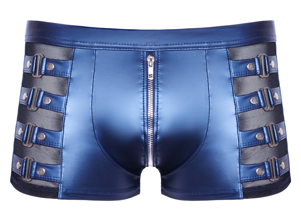 De metallic blauwe look van deze herenboxer geeft je outfit een sexy en glanzende look die meteen de aandacht trekt. De onderliggende ritssluiting in de buidel voegt een uitdagend en speels element toe, terwijl de stoere bandjes met klinknagels aan de zijkanten zorgen voor een kinky uitstraling. De zwarte, transparante powernet-inzetstukken onthullen net genoeg om de fantasie te prikkelen. Gemaakt van zacht en elastisch materiaal, biedt deze boxer een ongeëvenaard draagcomfort dankzij de afgedekte tailleband die heerlijk aanvoelt op de huid. Perfect voor een look die verleiding en comfort combineert.