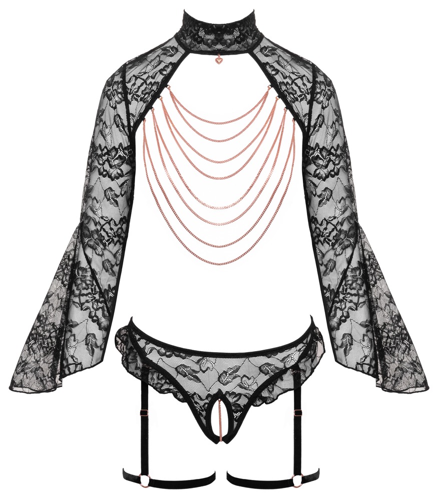 Wat een pure verleiding, de spannende ouvert set van Abierta Fina. De bustless bolero top en kruisloze jarretelslip zijn gemaakt van het fijnste zwarte bloemenkant, afgezet met fluweel en roségoudkleurige kettingen. De opstaande kraag met hartvormige hanger, de uitlopende mouwen en de afneembare kettingen zorgen voor een luxueuze en speelse uitstraling, die zijn weerga niet kent. Dankzij het zachte en elastische materiaal geniet je niet alleen van ultiem draagcomfort maar voel je je vol zelfvertrouwen en elegantie.