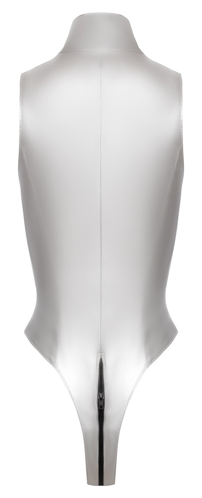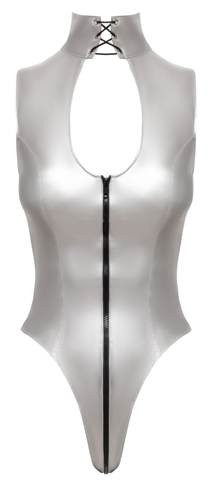Zilver kleurige vinyl body met een hoge veterkraag en ritssluiting.