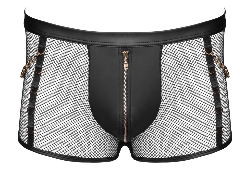 Deze zwarte mesh boxer is ontworpen voor mannen die clubwear zien als expressie. Het transparante mesh wordt gecombineerd met krachtige wetlook details en een afsluitbare pouch met rits, waardoor sensualiteit en comfort perfect in balans zijn.
